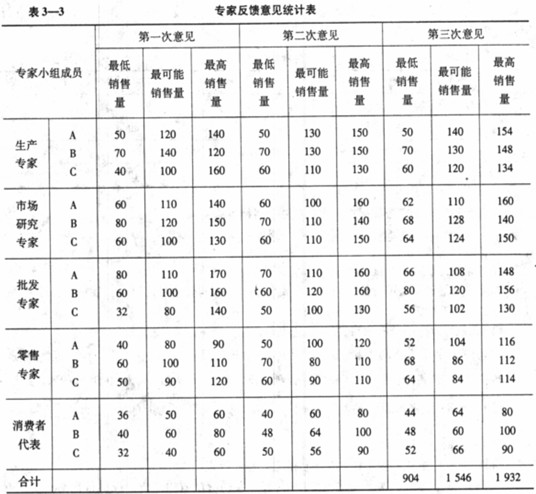 【例4】 某企業(yè)用德?tīng)柗品▽?duì)其七年的商品銷售量做預(yù)測(cè),邀請(qǐng)各方面專家共15位,各專家各自的反饋意見(jiàn)如表3-3所示。試運(yùn)用統(tǒng)計(jì)方法作出最后綜合預(yù)測(cè)結(jié)果(賦予最低銷售量、最可能銷售量、最高銷售量權(quán)重分別為0.1、O.8、O.1)。