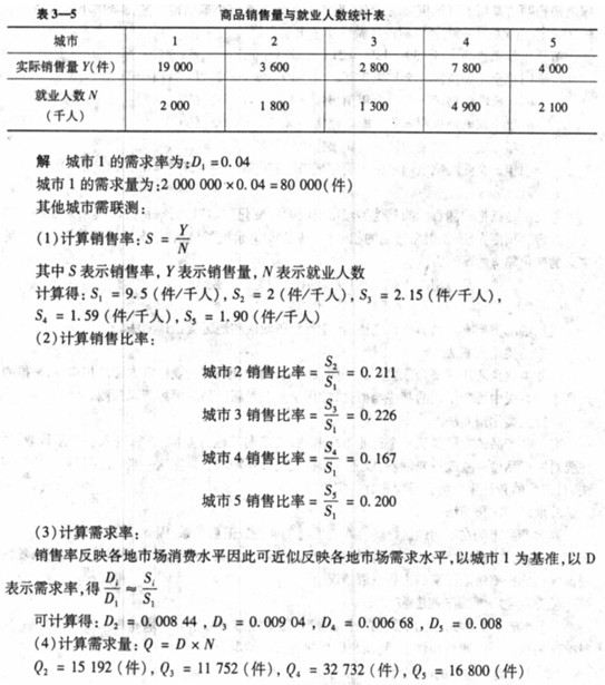【例7】假設某公司的商品主要在五個城市銷售,而且研究發現此商品與就業人數密切相關,公司記錄2010年的各城市銷售量如表3—5所示,經過對城市l市場的就業人員的抽樣調查發現,2011年該市就業人員對公司這種商品的購買量將為每100人4件,試預測2011年這五個城市該種商品的需求量。