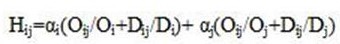 運(yùn)輸聯(lián)系強(qiáng)度是利用OD流分析方法,分析中心城市間相互作用強(qiáng)弱的一個(gè)指標(biāo),用以確定通道中節(jié)點(diǎn)的地位,其計(jì)算公式如下