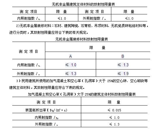 1)無機非金屬建筑主體材料:砂、石、磚、砌塊、水泥、混凝土、混凝土預制構件等其放射性限量應符合下表的有關規定。