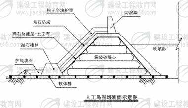 背景資料某近海水域,水深約15m,漲潮流速0.8m/s,落潮流速1.0m/s,設計低水位 0.5m,設計高水位 2.8m,地基土為粉質粘土。在該海區需建-800m×1000m矩形人工島,吹填區底標高-13.0m~-15.0m,施工作業環境較好。圍堰結構典型斷面示意圖如下。設計要求從距離人工島15km外、水深約20m的海區取粉細砂作為人工島陸域形成的填料,其含泥量控制在≤10%。