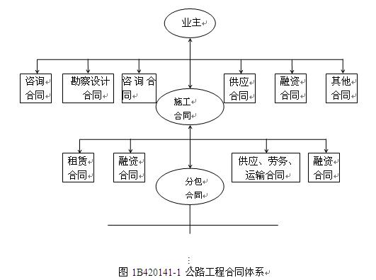 公路工程(特別是大型項目)建設是一個很復雜的過程,需要涉及許多不同行業的單位,投入許多不同專業的人力以及大量的資金設備。它們之間通過合同形成了不同的經濟關系,從而形成了復雜的合同體系(見圖1B420141-1) 其中,業主和承包人依法簽訂的施工合同是“核心合同”,業主又處于合同體系中的“核心位置”。