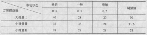 【例4】某廠在下一年擬生產某種產品,需要確定產品批量。根據預測估計,這種產品市場狀況的概率是:暢銷為0.3,一般為0.5,滯銷為0.2.產品生產采取大、中、小三種批量的生產方案,如何決策使本廠取得最大的經濟效益。其有關數據如表l一3所示。