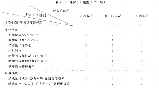 一般選擇1~3個方面的主要生態影響,依據表6-1列出的生態影響及生態因子變化的程度和范圍進行工作級別劃分,并且依據其中評價級別高的影響確定整個評價工作的級別。