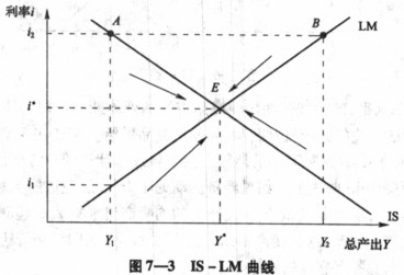 如前所述,IS曲線表示經濟均衡;LM曲線表示貨幣均衡。由于兩大市場是同時存在的。并且都受利率水平和收入水平的影響,因此,把兩條曲線放在同一直角坐標系內。兩條曲線的交點E必然同時滿足兩個條件:I=S,L=M ,如圖7—3所示。